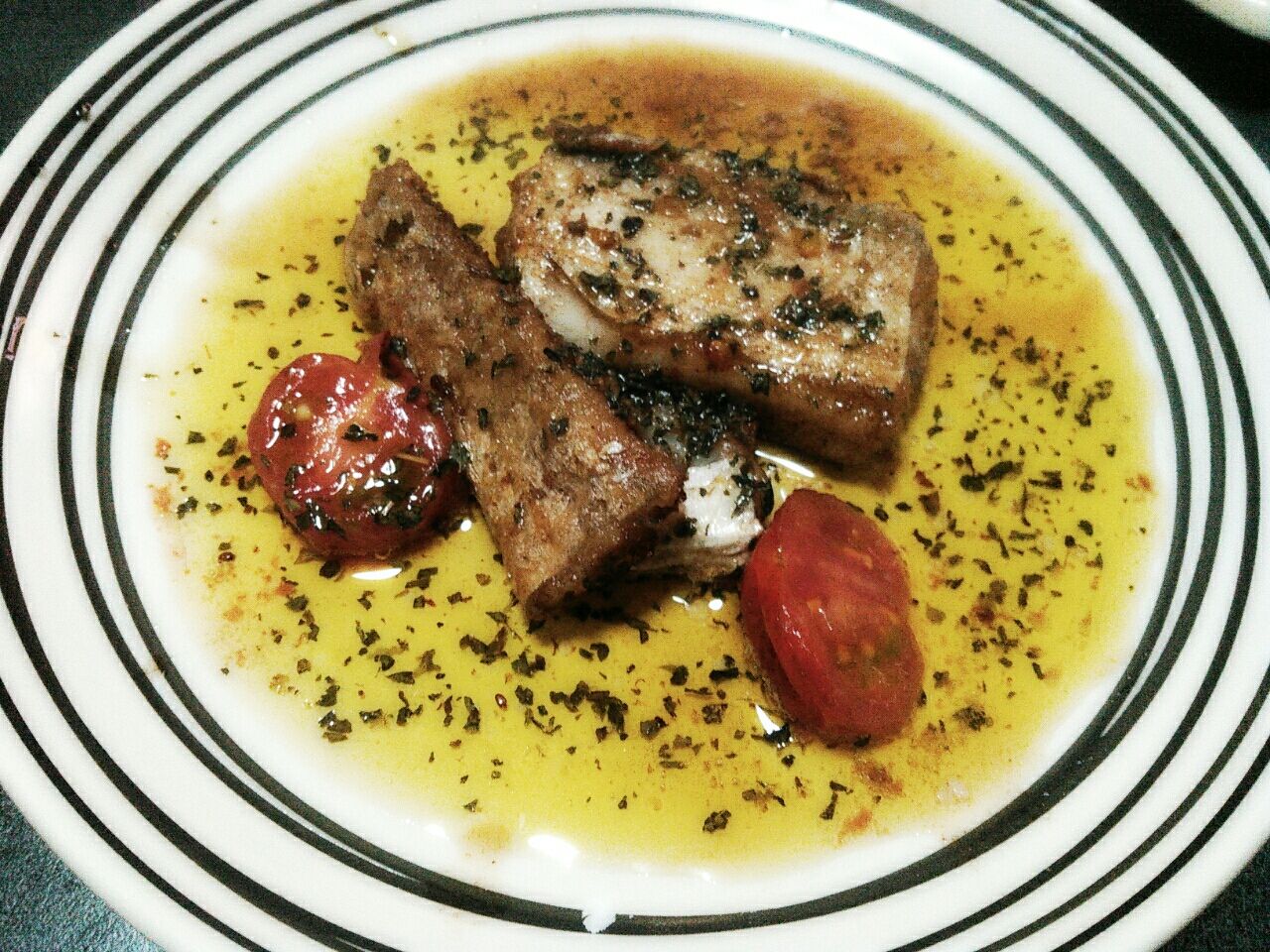 オリーブオイルと刻みバジルとレモン汁を混ぜたソースをムニエルに掛けて完成。(ノ≧ڡ≦)